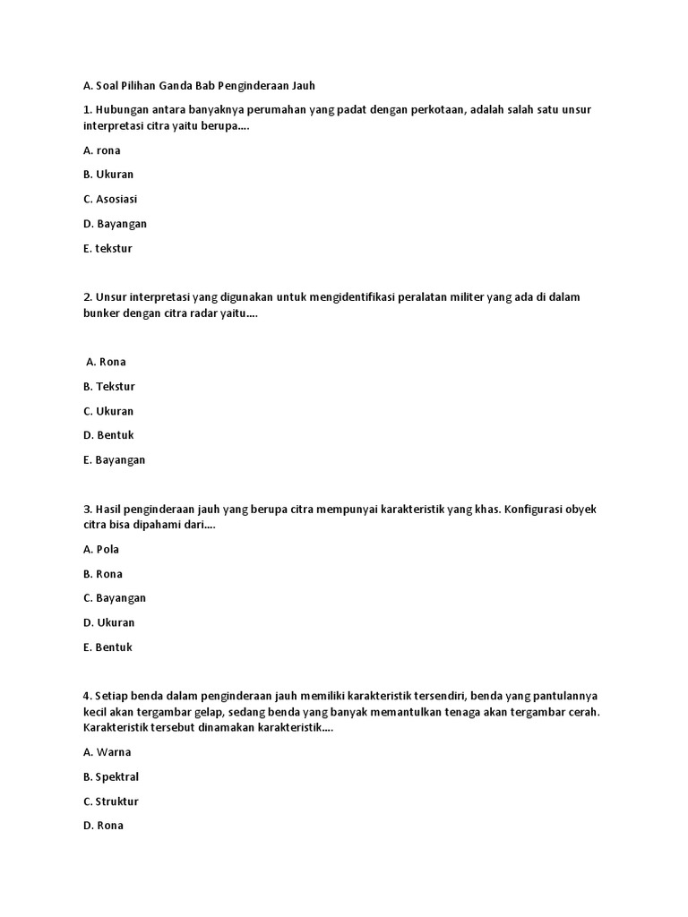 Soal Geografi Penginderaan Jauh Inderaja Kunci Jawaban Muttaqin Id from 1.bp.blogspot.com Soal geografi kelas 12 sma ma 2021 dan kunci jawabannya. Ccontoh soal essay geografi tentang pengindraan jauh dan jawabannya ilmusosial id. Contoh soal geografi kelas 10 lengkap dengan kunci jawabannya 2019 dan pembahasannya. Tuliskan manfaat pengindraan jauh dalam bidang ilmu kebumian dan bidang perencanaan! Dalam soal penginderaan jauh ini, kami menyediakan 55 soal pilihan ganda / pilgan (multiple choice) dan soal essai atau uraian. Berikut ini kami akan sajikan 20 soal pilihan ganda tenta. Contoh soal essay fisika dan jawabannya. Penginderaan jauh adalah suatu teknik merekam objek di permukaan bumi tanpa kontak langsung dengan objek tersebut.